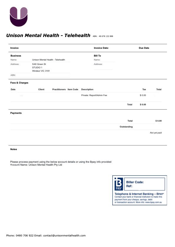 • For everyone else: Session fees are generally charged overnight, and a copy of the paid invoice is emailed to you. If a payment doesn’t process for any reason, we’ll send a copy of the invoice with a link so you can pay by BPAY, Google Pay, credit/debit card, or bank transfer.